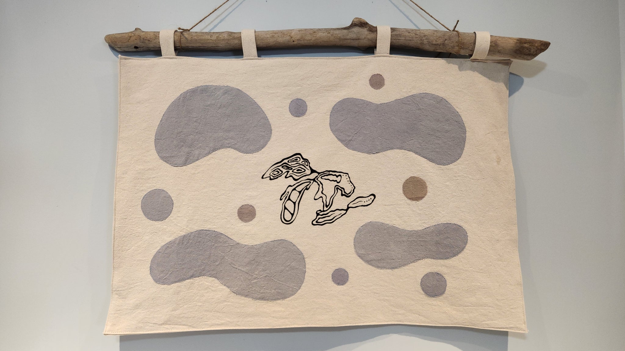 Wall hanging made with appliqued naturally dyed cotton canvas and screen printed Great Lakes design.